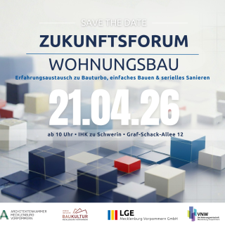 Der Wohnungsbau steht vor großen Herausforderungen – zwischen Nachfragedruck und Leerstand, knappen Ressourcen und dem Anspruch, kostengünstig und zugleich qualitätsvoll zu bauen bestehen vielfältige Anforderungen an die Akteure. Vor diesem Hintergrund laden die die Architektenkammer Mecklenburg‑Vorpommern, die LGE Mecklenburg-Vorpommern gemeinsam mit dem Verband norddeutscher Wohnungsunternehmen (VNW) herzlich zum Zukunftsforum Wohnungsbau ein, das den bisherigen Kommunalen Erfahrungsaustausch unter neuem Namen fortführt.